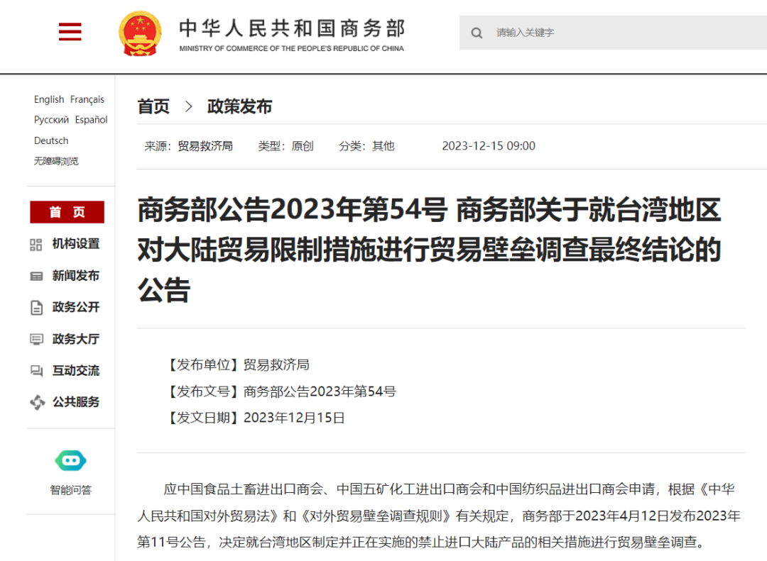 商务部今天(15日)发布公告,根据调查结果和相关规定,认定台湾地区对大陆贸易限制措施,构成贸易壁垒。