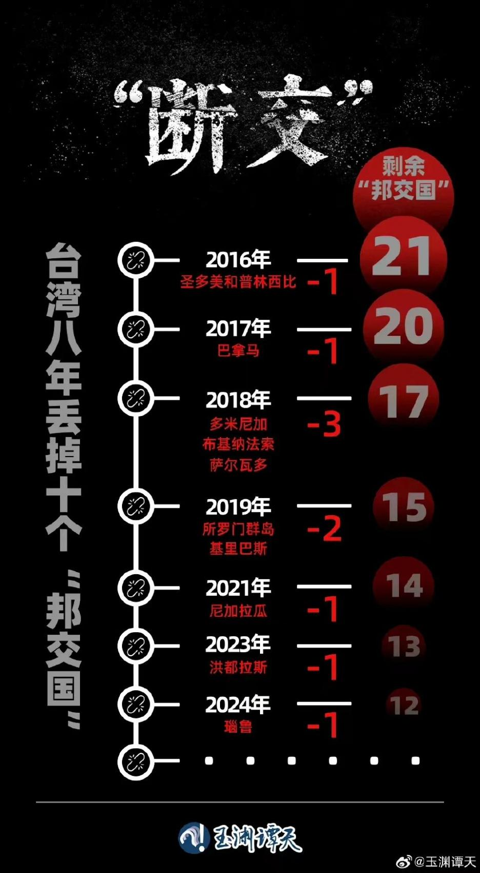 台湾方面陆委会前副“主委”赵建民也表示,现在台当局的所谓“邦交国”仅剩12个,未来民进党赖清德执政的话,台当局在国际上可能消失(即“邦交国”为0)。台湾“中时新闻网”发文评论称,民进党当局越是突出对抗和“反陆”,大陆就把话挑得更明。