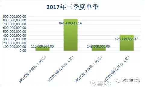 海外部分的收入可以占到海能达的一半左右,按照三季度31亿的收入规模,海外部分约15亿左右。那么我们看moto,moto的北美市场可以占到60%以上的比例,以2016年的数据来看,60亿美金的收入规模,海外部分大约为24亿美金。这24亿美金的市场,将会成为海能达蚕食moto份额的重要部分。