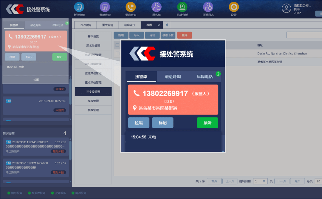 智能接处警系统除 快速接警受理、 处警调度外,还支持 远程警点座席,能够以浏览器方式远程接入,用于接收指挥中心传来的警单并处理。此外,海能达智能接处警系统 班长座席除具备普通座席的功能外,还具备 当日呼叫与警情统计与展示、座席状态监控、 座席通话监听与干预等高级功能。