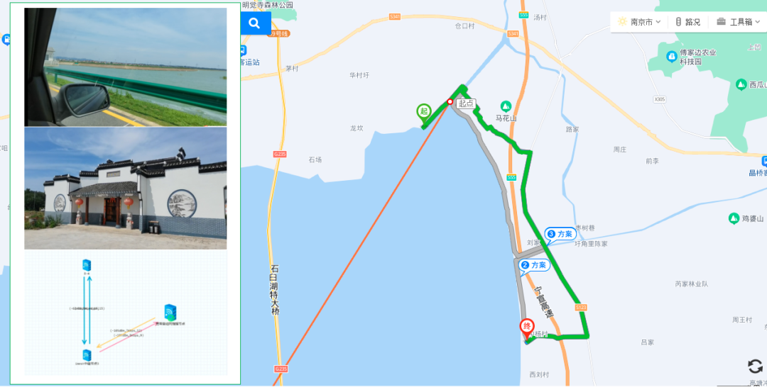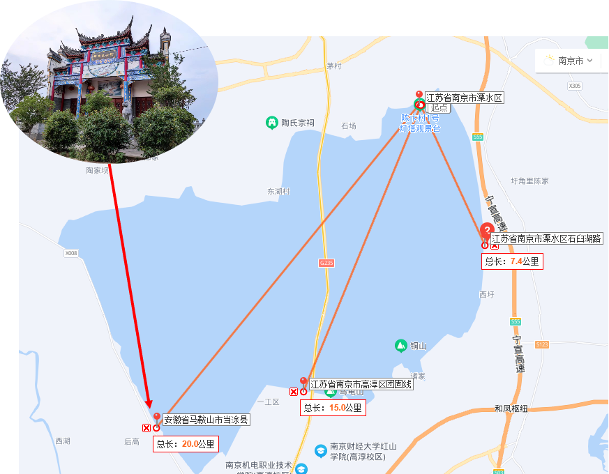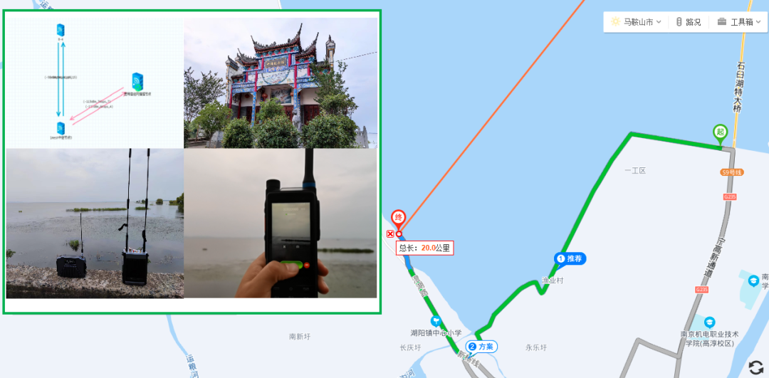 下一步确定拉远的测试点,地点我们选在了距观景点20公里,位于马鞍山市当涂县湖阳镇境内的石臼湖边的邢珣纪念馆附近。为测试不同拉远距离的音视频通联效果,我们在中途7.4公里和15公里处设置了两个沿途测试点。