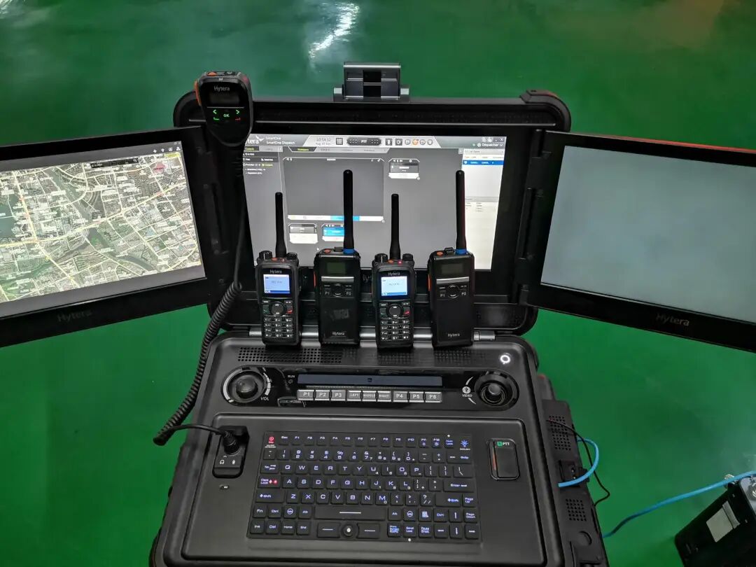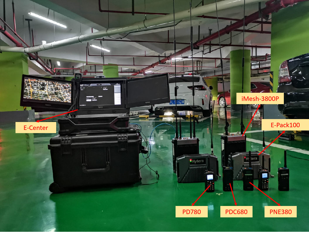 本次测试准备的装备有:1台三屏指挥箱E-center、2台宽带自组网背负台iMesh-3800P、2台数字无线自组网转发台E-pack100、2台宽带自组网对讲机PNE380、2台专业数字对讲机PD780、1台多模智能对讲机PDC680。