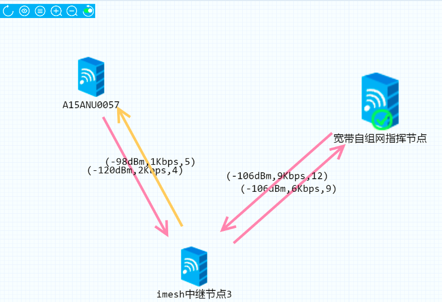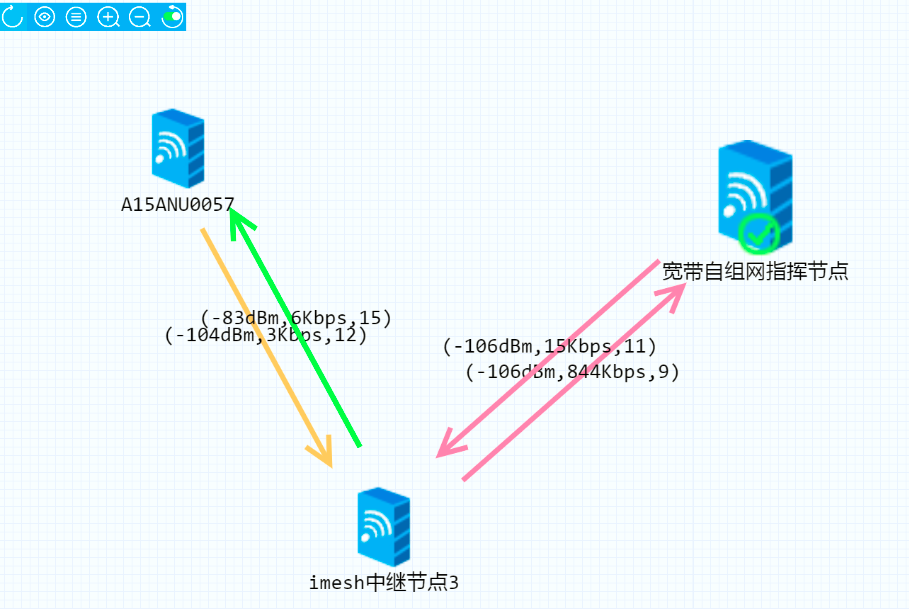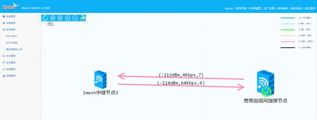 从指挥箱网管,获取两台Mesh基站的信号:-113dbm,4kbps,7;-114dbm,64kbps,6;可以看到停车场的环境对基站信号的干扰还是很明显的。