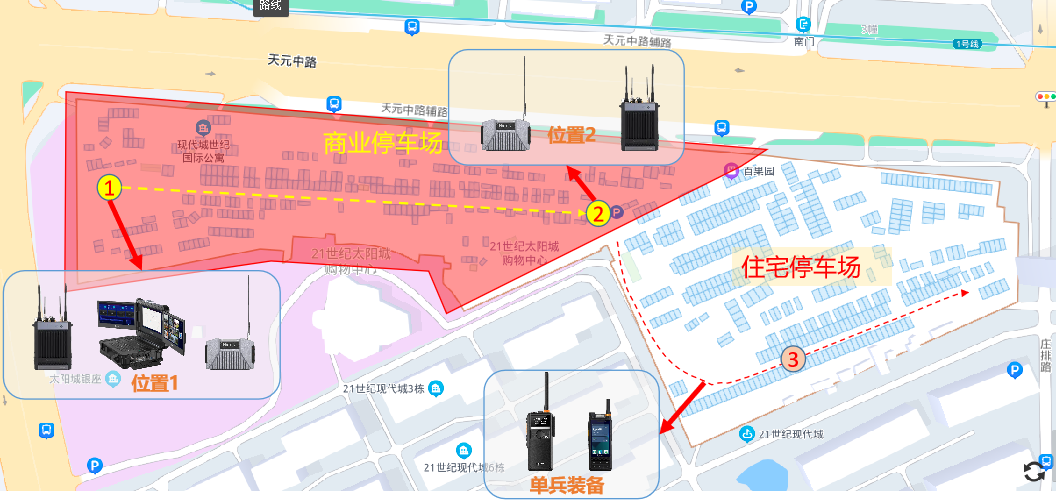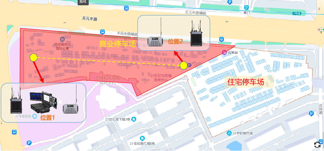 本次评测选择南京市江宁区太阳城地下车库,用于验证海能达自组网解决方案在复杂地下空间音视频通信保障的能力。21世纪太阳城是南京面积最大的主题乐园购物中心!20万平米商业面积,9万平米商业停车楼 ,2500个机动车停车位。