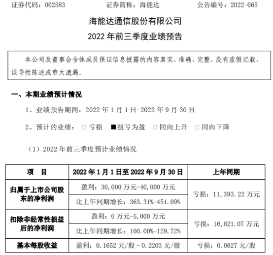 海能达(002583)近日发布2022年前三季度业绩预告,报告期内归属于上市公司股东的净利润30,000万元-40,000万元,较上年同期扭亏为盈;基本每股收益0.1652元/股–0.2203元/股。