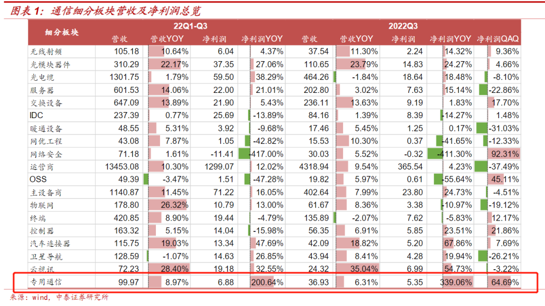 据中泰证券(600918)研报显示,通信设备板块前三季度营收同比增长超10%,净利润同比增长20%,通讯设备各子板块中,专用通信板块净利润增速最高,剔除国内专网终端龙头海能达(002583)出售赛普乐带来的极值影响,专网通信行业三季度同比增长也有70%以上。