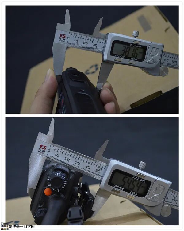 对讲机宽度和厚度:宽度,最窄处为54.63mm,最宽处为62.32mm,相差7.69mm,差距挺大。厚度,最薄处为37.70mm,最厚处为38.16mm,相差0.46mm,差距不大。