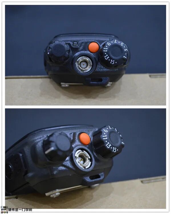 顶部上图,从左往右,左侧旋钮为音量调节按钮,白色指示档位。接着是天线接口,下图看出这个接口是个公口,里面有个针。然后是橙色的TK按键,非常显眼。最后则是频道旋钮,上面标注了1-15个频道。