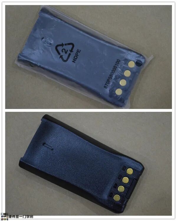 电池正面:电池由HDPE材料塑料薄膜包装。HDPE,高密度聚乙烯(High Density Polyethylene),是一种结晶度高、非极性的热塑性树脂。具有优良的耐大多数生活和工业用化学品的特性。拿掉塑料薄膜,可以看到电池表面很简洁,无任何图案,底部有4个供电触点。