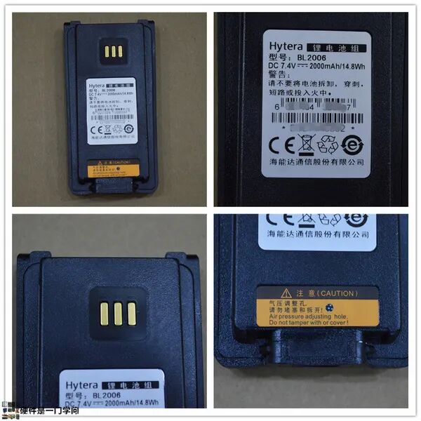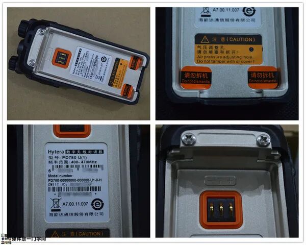 背面底部的两个螺丝分别贴上了橙色防拆贴,并且在气压调整孔位置给予了黄色警告,请勿堵塞或拆开。中间则为对讲机的产品型号、Model number、CMIIt ID等信息。上部为电池供电接口,三个铜接头分别标注了“-、T、+”。