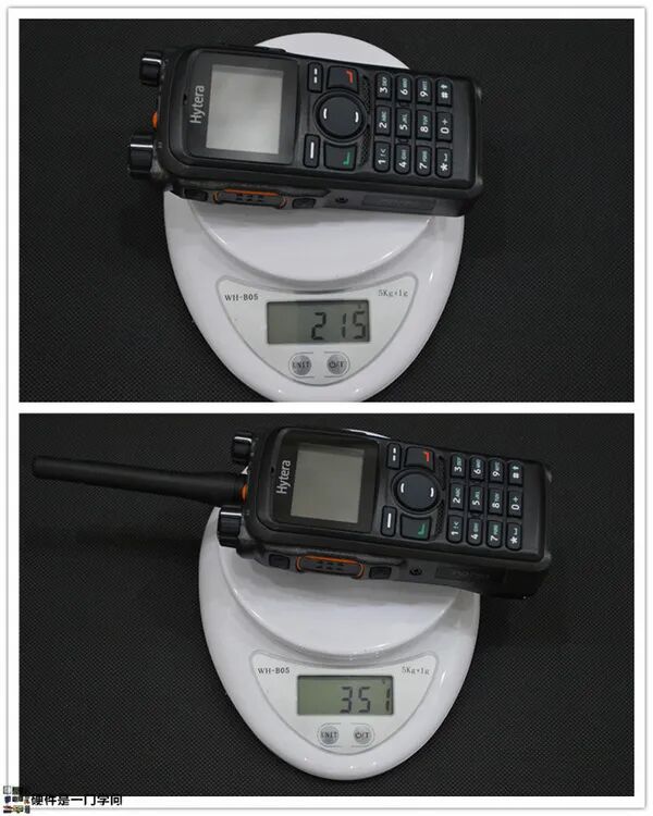 重量对比:对讲机裸身为215克,装好天线和电池后,重量为351克,增加了136克。所以,没安装电池前,对讲机拿在手里还挺轻,装上各种配件后,重量里面增加,分量就沉甸甸的了。