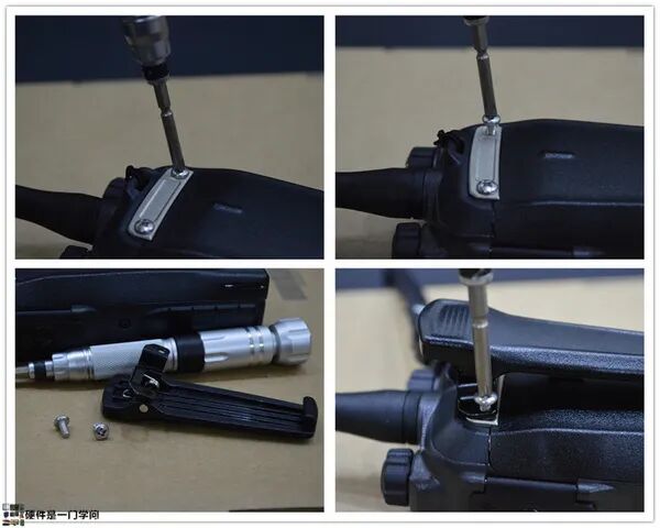 皮带夹安装略显复杂,复杂不是安装步骤,而是需要螺丝刀工具。先把机身屏蔽罩顶部的两颗螺丝下掉,将皮带夹的孔与机身孔位对齐,拧上螺丝即可。这里如果能够设计成卡扣式,应该更方便一些。不过也能理解,因为这个是工业级的产品,用螺丝固定更结实、更稳定。