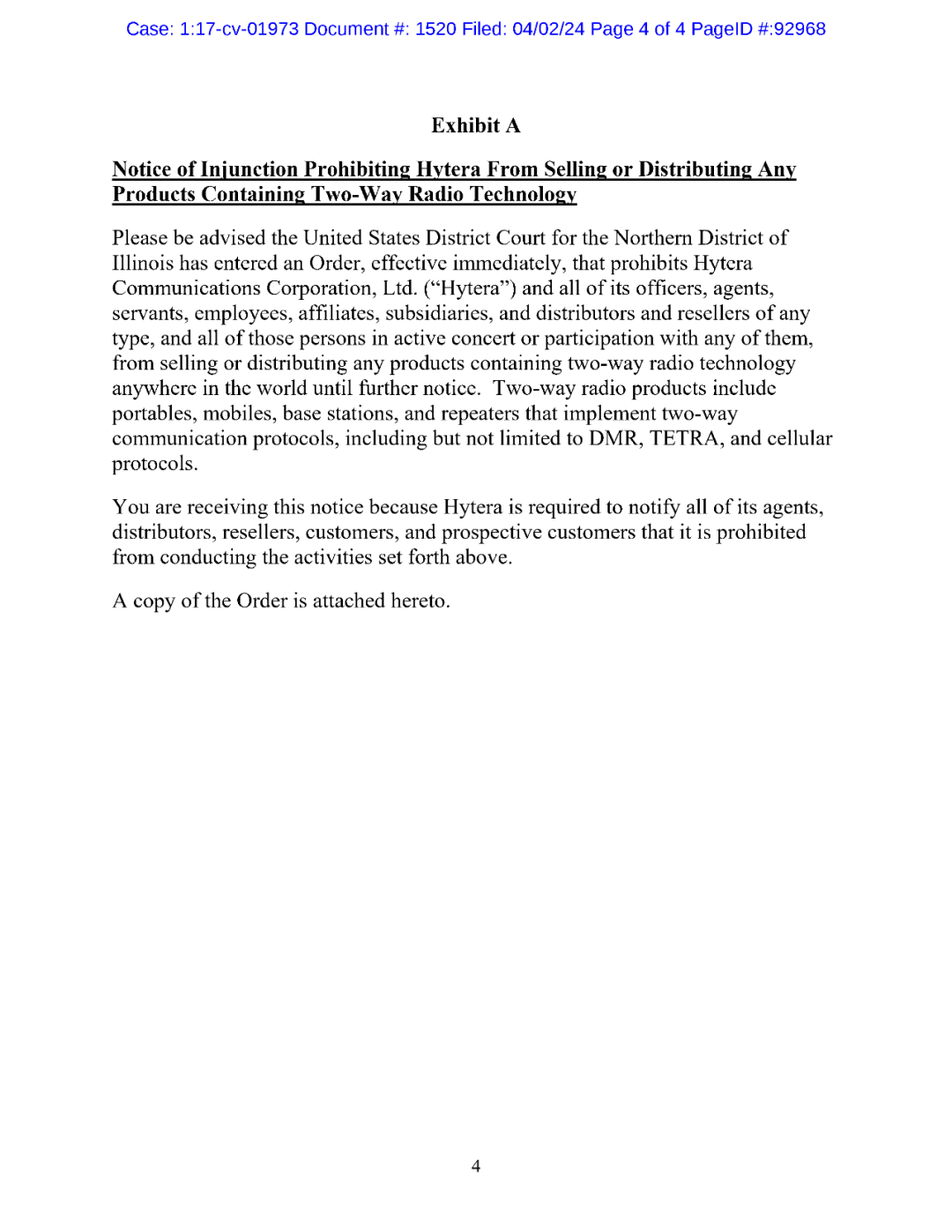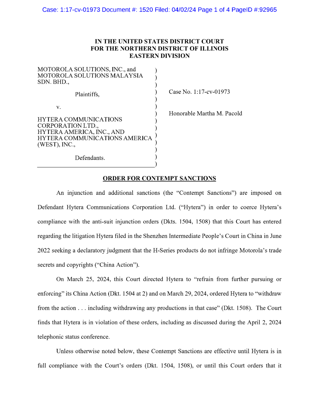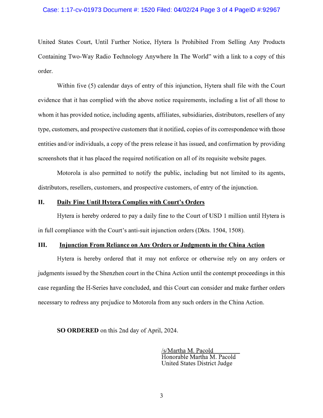该命令自2024年4月2日起生效,直到海能达完全遵守法院的命令或法院另有指示为止。