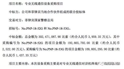 公告称,本次中标总金额为302,471,087.90比索(约合人民币3,959.35万元),其中采购编号为No.PNP-18-52G的项目金额为192,665,792.00比索(约合人民币2,522.00万元),采购编号为No.PNP-18-53G的项目金额为109,805,295.90比索(约合人民币1,437.35万元)。菲律宾国家警察总局在下发中标通知时的同时,向JointVenture下达了采购订单。