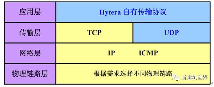 物理链路层:它是TCP/IP的最底层,一般来说是通过有线链路的方式达到互联互通的目的,也可以通过网桥、3G设备等无线链路设备达到互联效果。网络层:也称IP层,该层把分组封装到IP数据报中,填入数据报的首部,使用路由算法来选择数据报的传输途径。然后把数据报交给下面的网络接口层中的对应网络接口模块。传输层:其功能是使源端主机和目标端主机上的对等实体可以进行会话。分为TCP和UDP协议。应用层:将OSI参考模型中的会话层和表示层的功能合并到应用层实现。应用层面向不同的网络应用引入了不同的应用层协议。因此,从上图中可以看到,海能达通信股份有限公司提供的IP互联功能在传输层上采用的是UDP协议,而在应用层采用的是海能达通信股份有限公司自有的传输协议,在网络层和物理链路层上,根据实际的需求可以选择不同的协议及设备实现IP互联。