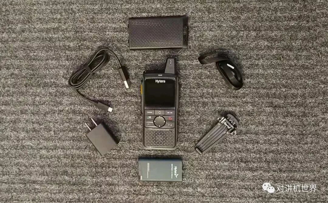 下面是我们的一张开箱全家福,包含对讲机和5大配件包括充电头、USB充电线、背夹、挂绳和电池。官方配件没有耳机,用户可以根据实际应用场景按需采购。