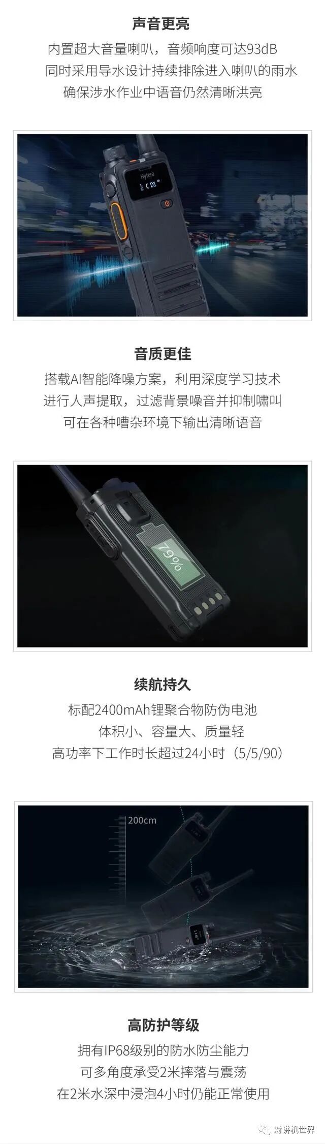 相比上一代PDT数字对讲机,HP700的语音质量也有很大提升。前置超大喇叭音量更大,搭载降噪算法横扫一切背景噪声,更有导水设计快速排出喇叭进水,三管齐下,让HP700全天候、各种嘈杂环境下都能输出清晰洪亮的声音。