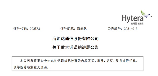 1月12日海能达披露关于重大诉讼的进展公告称:美国当地时间2021年1月11日海能达已经收到美国伊利诺伊北区联邦地区法院通知,法官针对海能达与摩托罗拉、摩托罗拉马来西亚公司之间的商业秘密及著作权侵权诉讼案件的一审判决的判赔金额及双方在审后程序提交的部分动议作出决定。