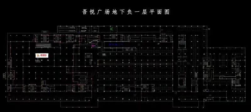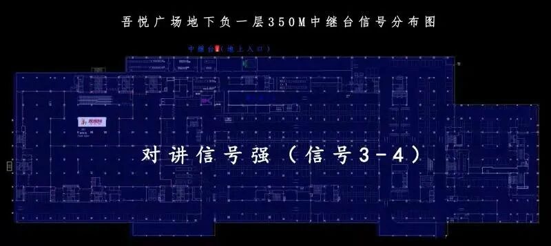 在场景二的基础上,将无线自组网转发台由地下转移至地上入口处,地下人员使用350M电台,对各区域进行逐一测试,测出覆盖区域强弱分布点,负一楼全部覆盖,对讲信号较强,均为三到四格信号,通过测试,数字无线自组网转发台位置设置对信号强度影响较大,分布情况如图所示: