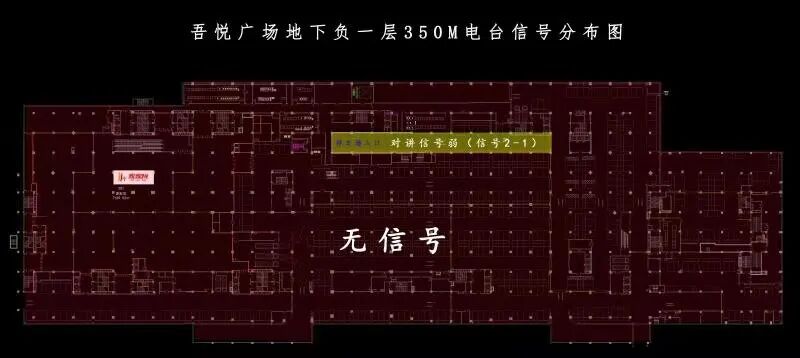 商场地下建筑最长跨度为320米,最宽跨度为110米,面积为30500平方米。针对地下建筑通信不利的特点,首先利用350M电台进行点对点对讲测试,设置两部电台对讲地点,一部设置在指挥部作为值守台,另一部设置在地下建筑内,地上位置保持不动,在地下建筑内不间断走动测试。通过350M电台对讲测试,仅在地下车库入口处有微弱信号,其余位置均无信号,信号分布情况如图所示: