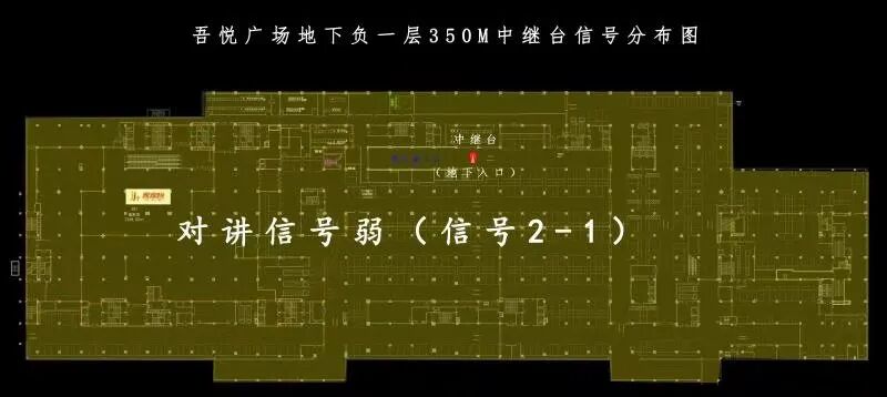 在350M电台测试的基础上,在地下车库地下入口处架设一个数字无线自组网转发台进行信号转发,地下人员使用350M电台,对各区域进行逐一测试,测出覆盖区域强弱分布点,负一楼全部覆盖,但对讲信号较弱,均为一到两格信号,信号分布情况如图所示: