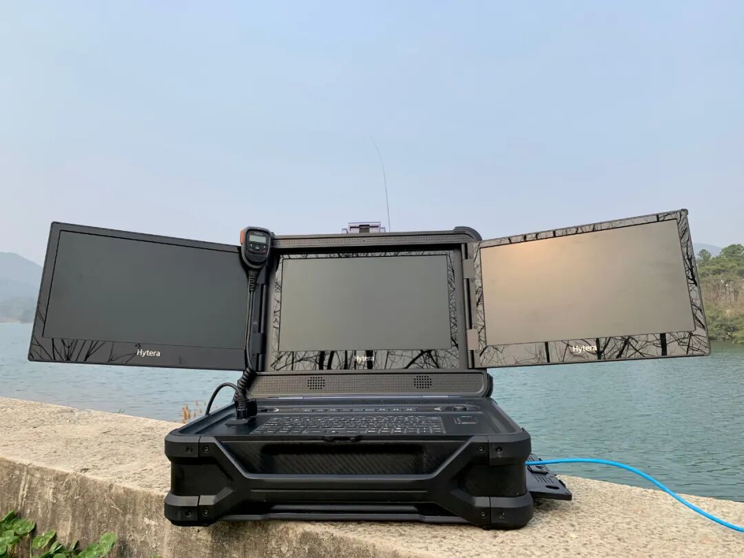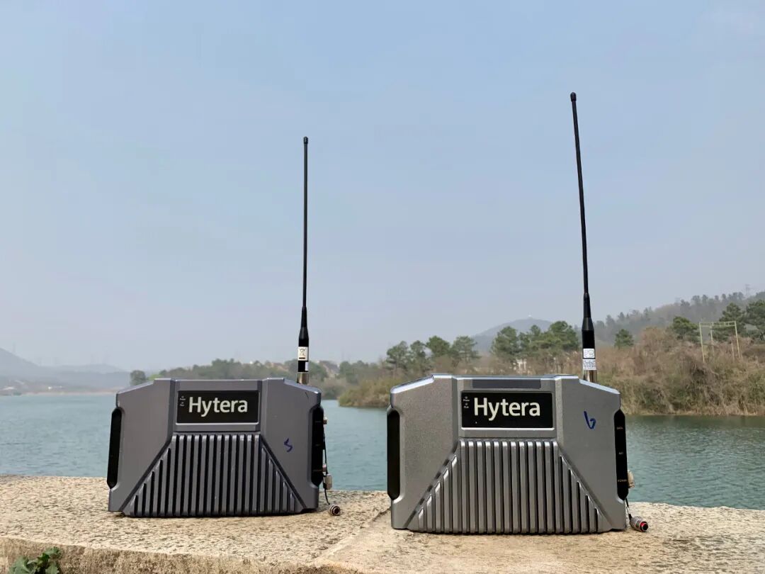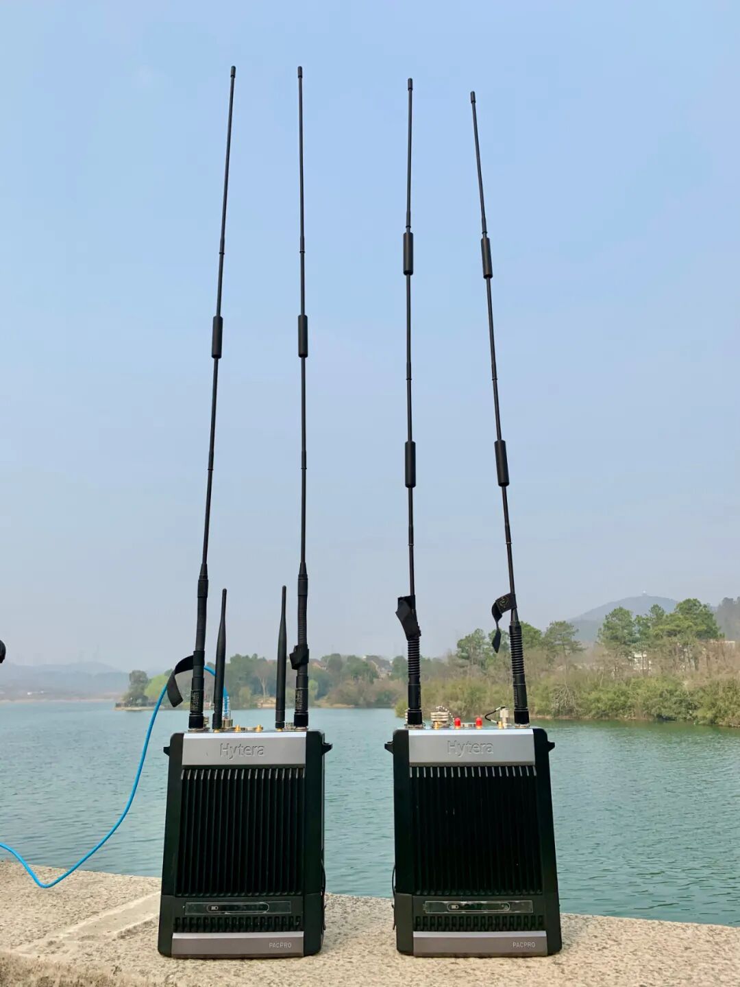 团队在横山水库大坝处选取了一个开阔地,用于部署临时指挥部,海能达的全套便携系统部署起来还是很方便的。为E-pack100窄带自组网基站和iMesh-3800P宽带自组网基站安装天线(宽带含WiFi天线),一键开机后,基站自动实现互联。