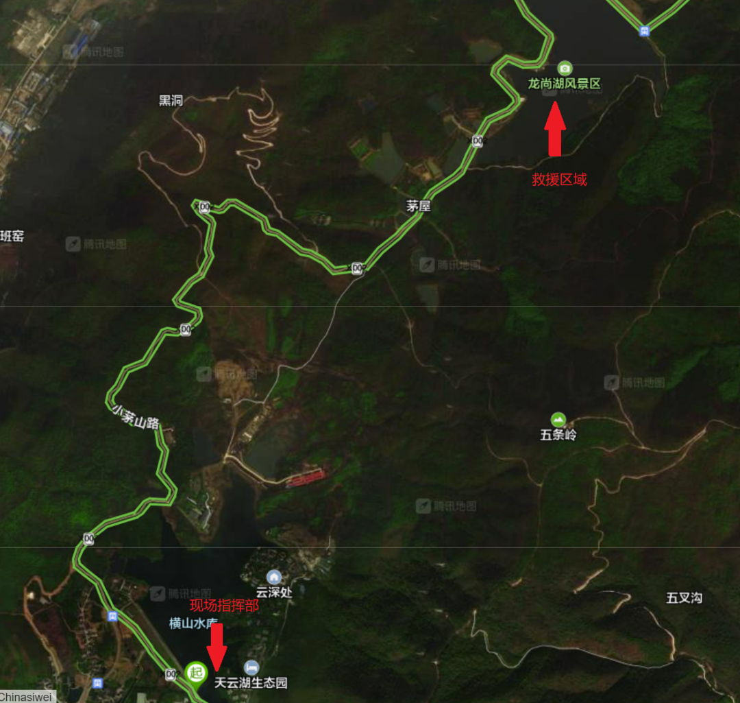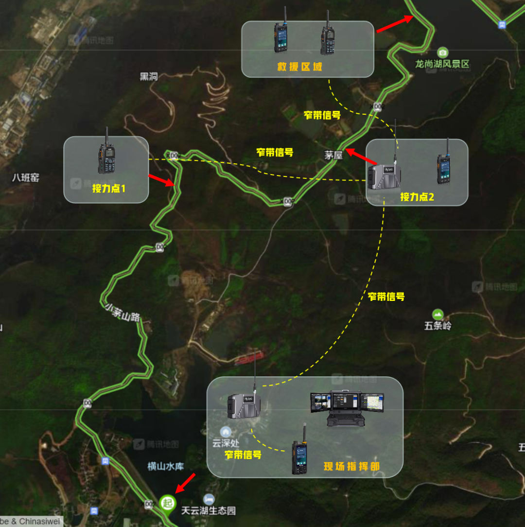 本次评测模拟南京市江宁区青龙山龙尚湖水库,突发安全事故。救援队车辆在横山水库进山口遇阻,车队无法进山,救援队只能步行突进到救援区域。在横山水库部署现场临时指挥部,救援队通信保障小组以自组网基站和自组网手台接力组网,实现现场指挥部到龙尚湖水库救援区域的通信。支持救援作业区与现场指挥部语音通信和视频回传。