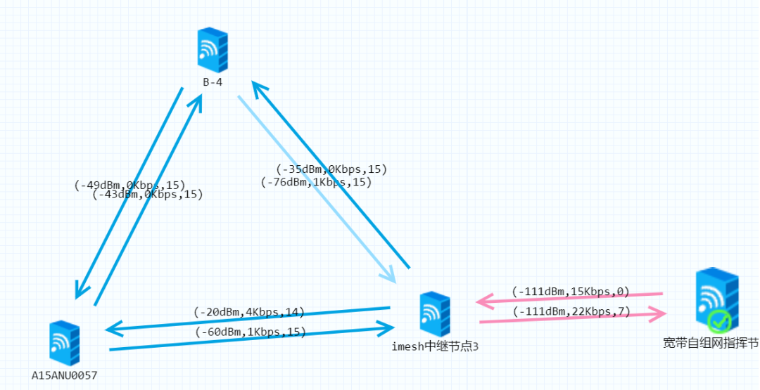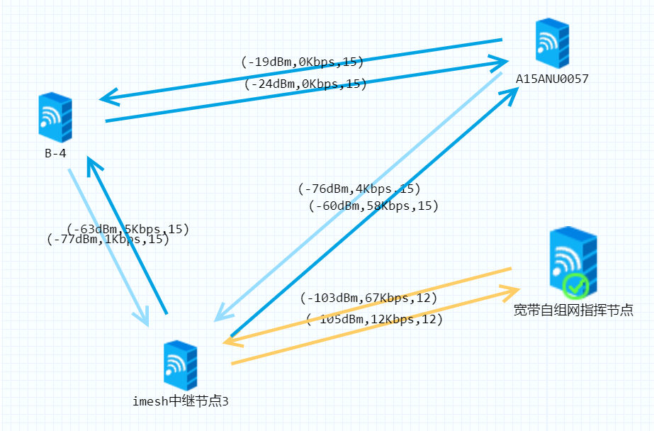 节点1的Mesh基站与突进Mesh手台信号为-115dbm~-120dbm |
