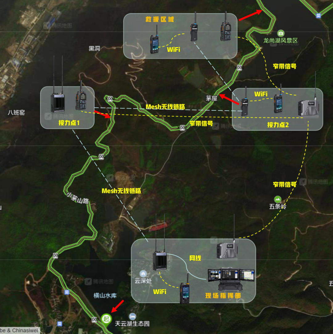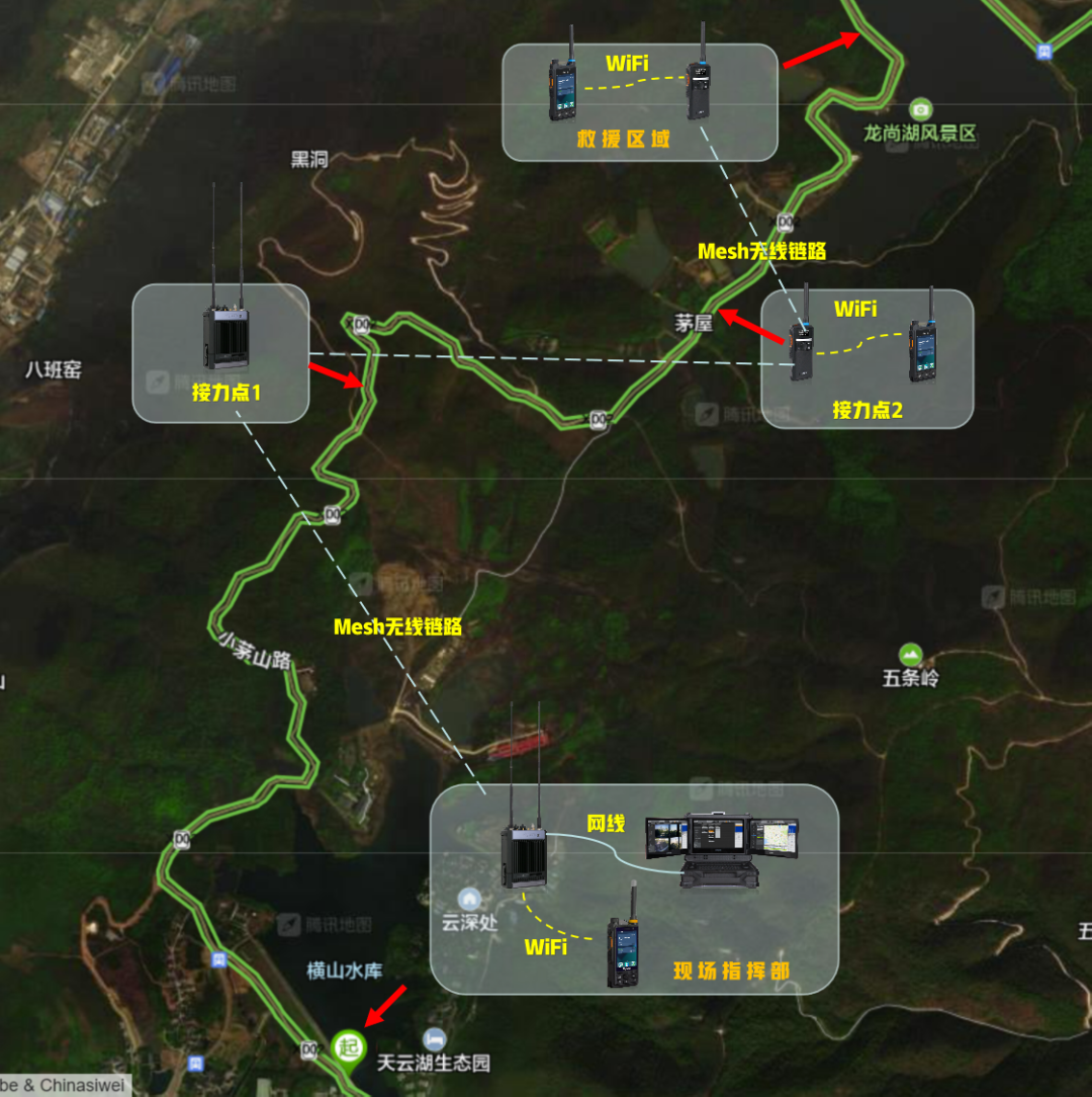 在救援沿途部署iMesh-3800P宽带自组网基站和PNE380宽带自组网多模终端做为中继接入点,实现Mesh无线信号的覆盖延伸。
