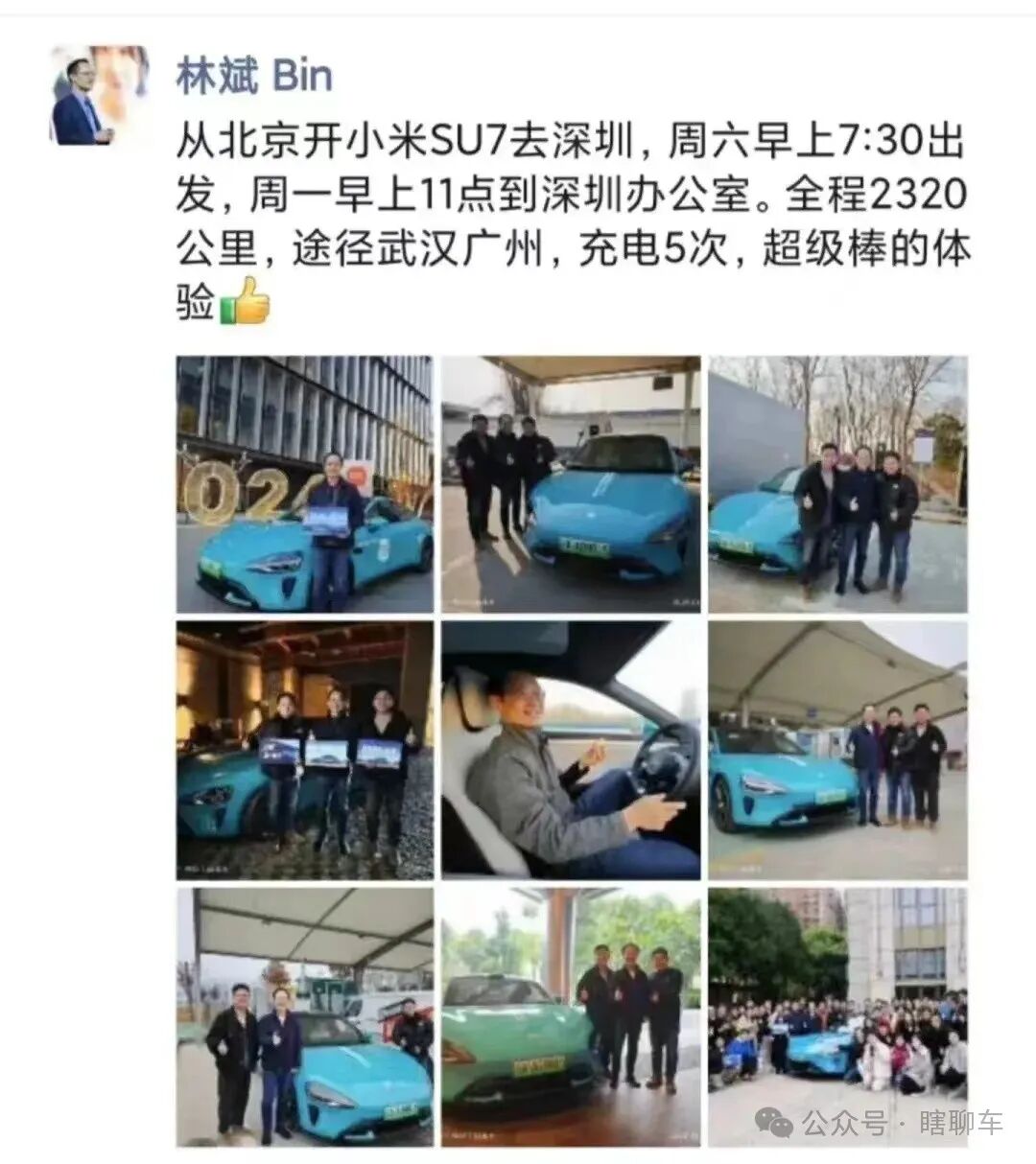 几天前,小米副董事长林斌驾驶小米SU7从北京出发去深圳,总共行程2320公里,途经武汉、广州,总共充电5次。