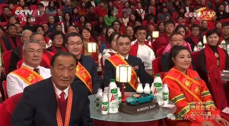 在春晚上介绍“七一勋章”获得者代表、“时代楷模”中国援外医疗队群代表等环节时,镜头中可以明显看到小米汽车 SU7的车模摆在桌上。