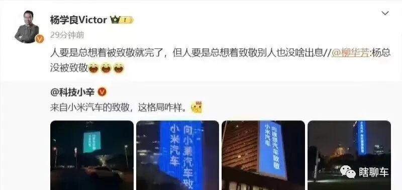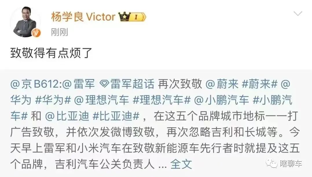 包括吉利汽车高级副总裁杨学良,吉利集团新闻发言人,杨学良转发并且回怼雷军:“致敬的有点烦了”、“过了”、“我们不跟小米比”、“超越 007,试试吧”。