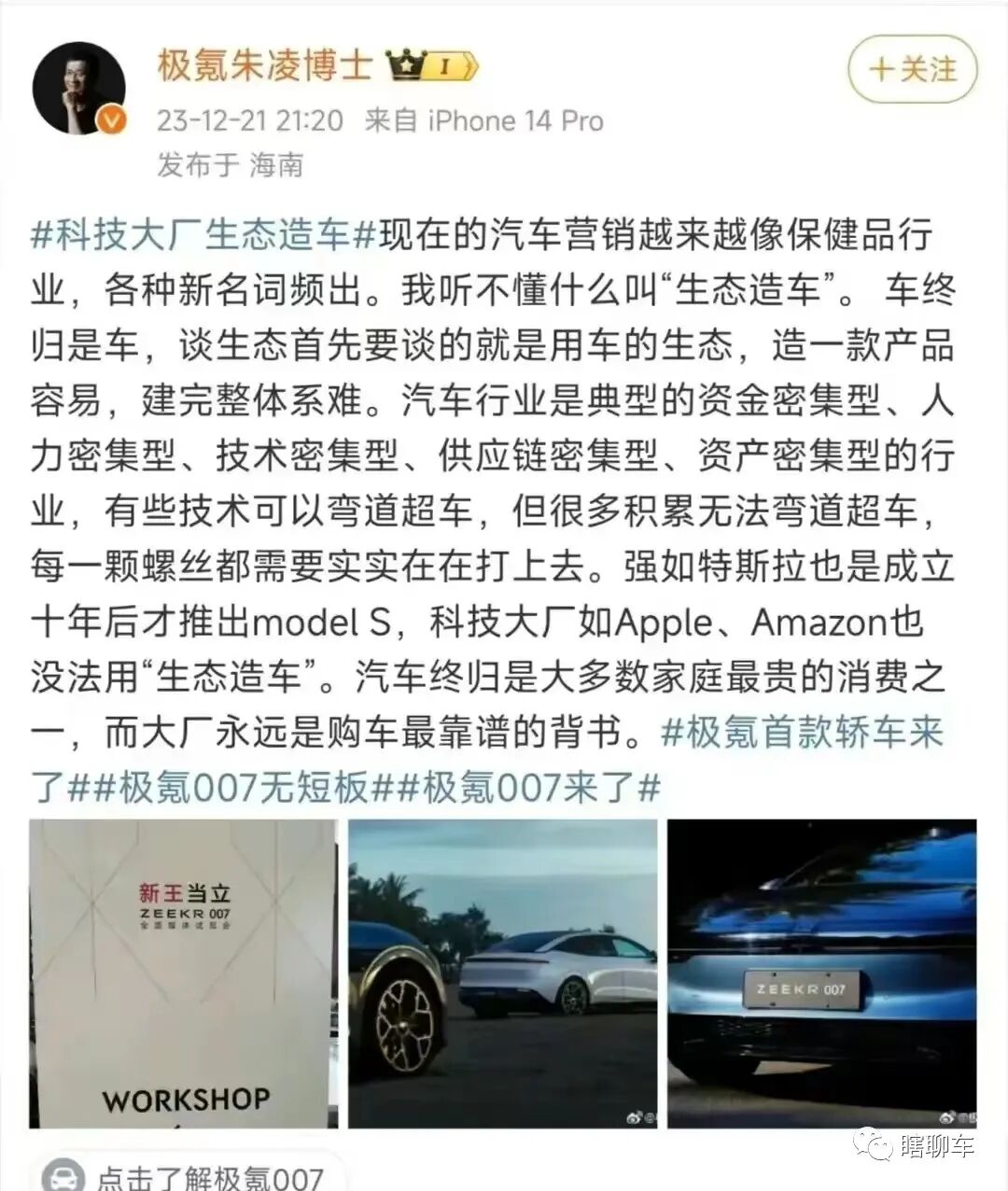 极氪智能科技副总裁朱凌,曾经也在网上发过帖子,专门嘲笑小米汽车的研发进展和技术实力。他称小米汽车是“米粉玩具车”,质疑其“生态造车”的必要性,更表示,汽车行业需要积累,无法弯道超车,“每一颗螺丝钉都需要实实在在打上去”。