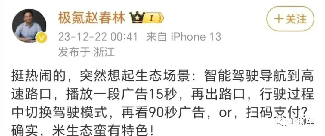 极氪副总裁赵春林,也发文嘲笑小米造车,嘲讽表示小米生态的使用场景,“导航到高速路口,先看15秒广告再出路口,行驶过程中切换驾驶模式,再看90s广告,or,扫码支付,米生态蛮有特色”。来暗讽小米生态广告多。