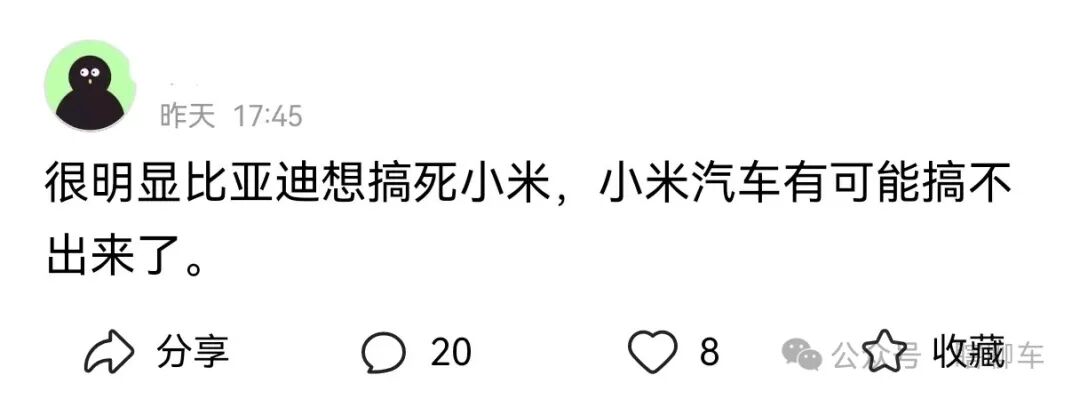 “很明显比亚迪想搞死小米汽车,小米汽车有可能搞不出来了”。