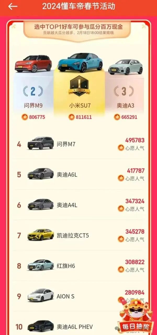 在2024年春节期间,某车帝搞了一场“人气最高的汽车”竞选活动,小米SU7力压群雄,获得了人气最高汽车冠军,而已经上市并且开始交付的华为问界M9,只获得了亚军。