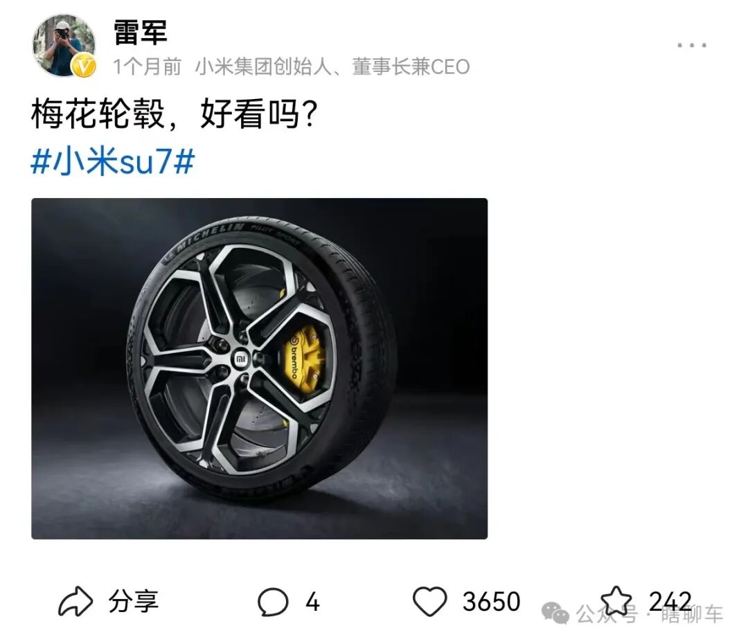 雷总,一天发5条小米SU7的动态,大到小米SU7的电机、外观设计,小到一个轮毂形状,一个后视镜形状。