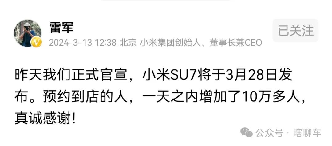 雷总说:“昨天我们正式官宣,小米SU7将于3月28日发布。今天预约到店的人,已经增加了10万多人,真诚感谢”!