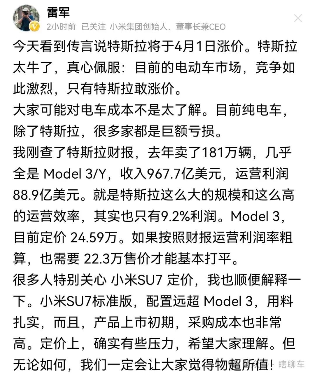 最近,关于特斯拉4月1日涨价的传言,也引起了雷总的注意。