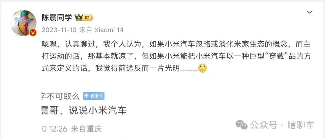 比如,他在2023年11月10日曾经就说过:“如果小米SU7忽略或者淡化米家生态的概念,而主打运动的话,那基本上凉凉了,如果,小米能把小米汽车以一种巨型穿戴品的方式来定义的话,我觉得前途反而一片光明”。