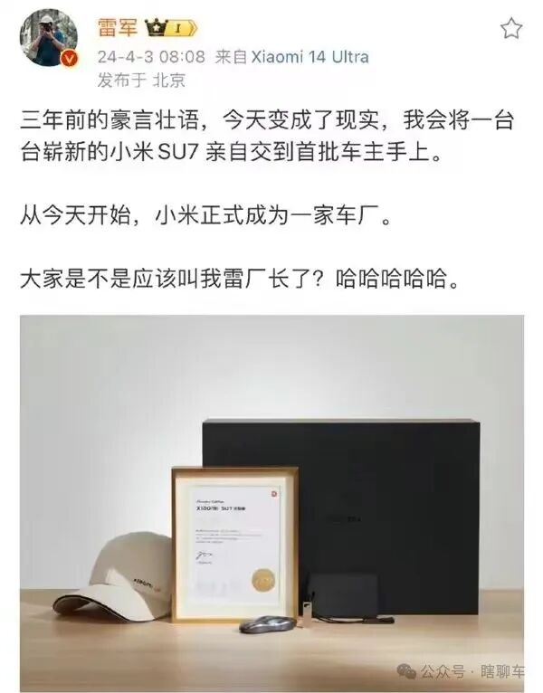 雷总在早些时候还发文调侃自己,真的成了雷厂长:“三年前的豪言壮语,今天变成了现实,我会将一台台崭新的小米 SU7 亲自交到首批车主手上。从今天开始,小米正式成为一家车厂。大家是不是应该叫我雷厂长了?哈哈哈哈哈。”