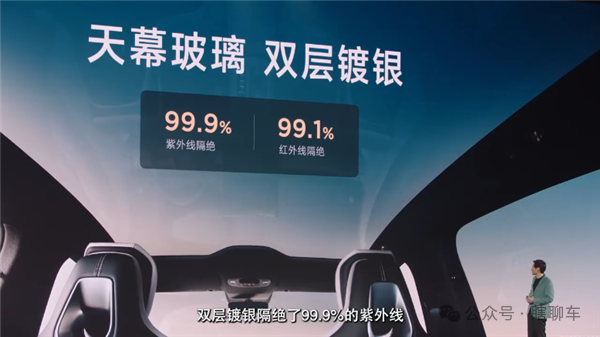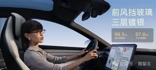 SU7采用了双层镀银的超大天幕玻璃,紫外线隔绝率达99.9%,红外线隔绝率达99.1%。