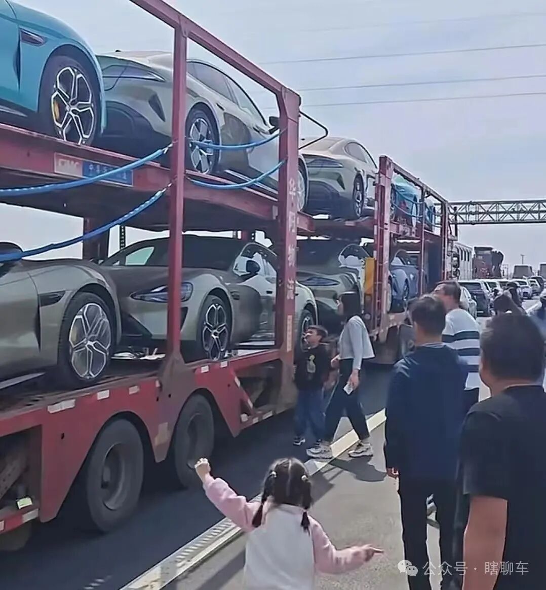 有网友就在堵车的时候,偶遇小米SU7运输车,然后,一板车的小米SU7就成了整个高速路上最靓的仔,小米SU7也就秒变“车展”,男女老少,大家纷纷下车开始围观了起来。