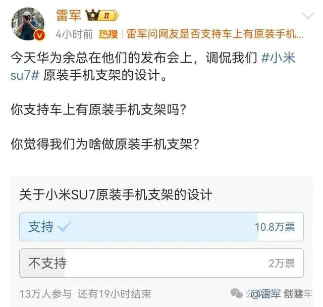 雷总说:“今天华为余总在他们的发布会上,调侃我们小米SU7原装手机支架的设计,你支持车上有原装手机支架吗?你觉得我们为啥做原装手机支架?”,并且还发起了一项关于是否支持小米SU7原装手机支架设计的投票。