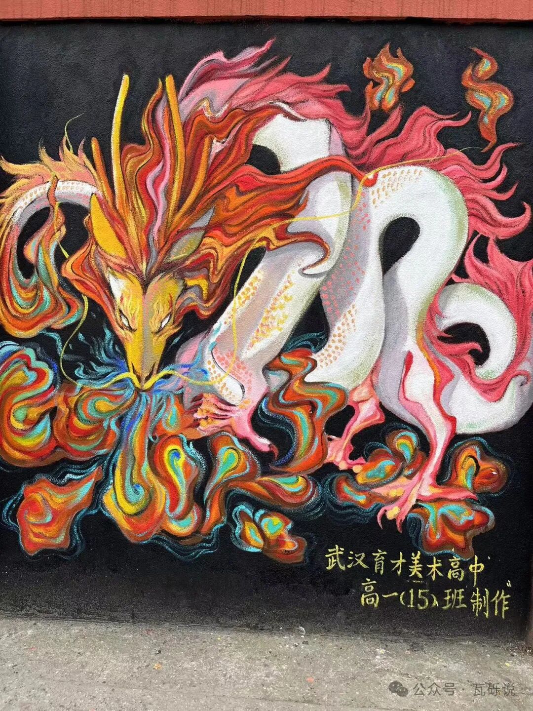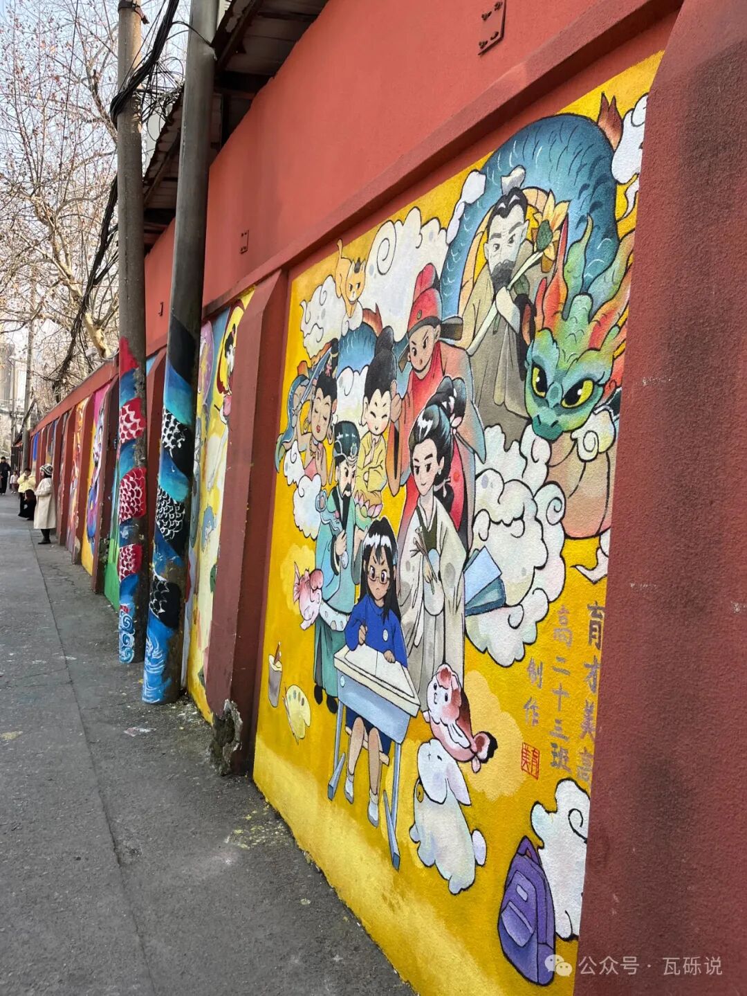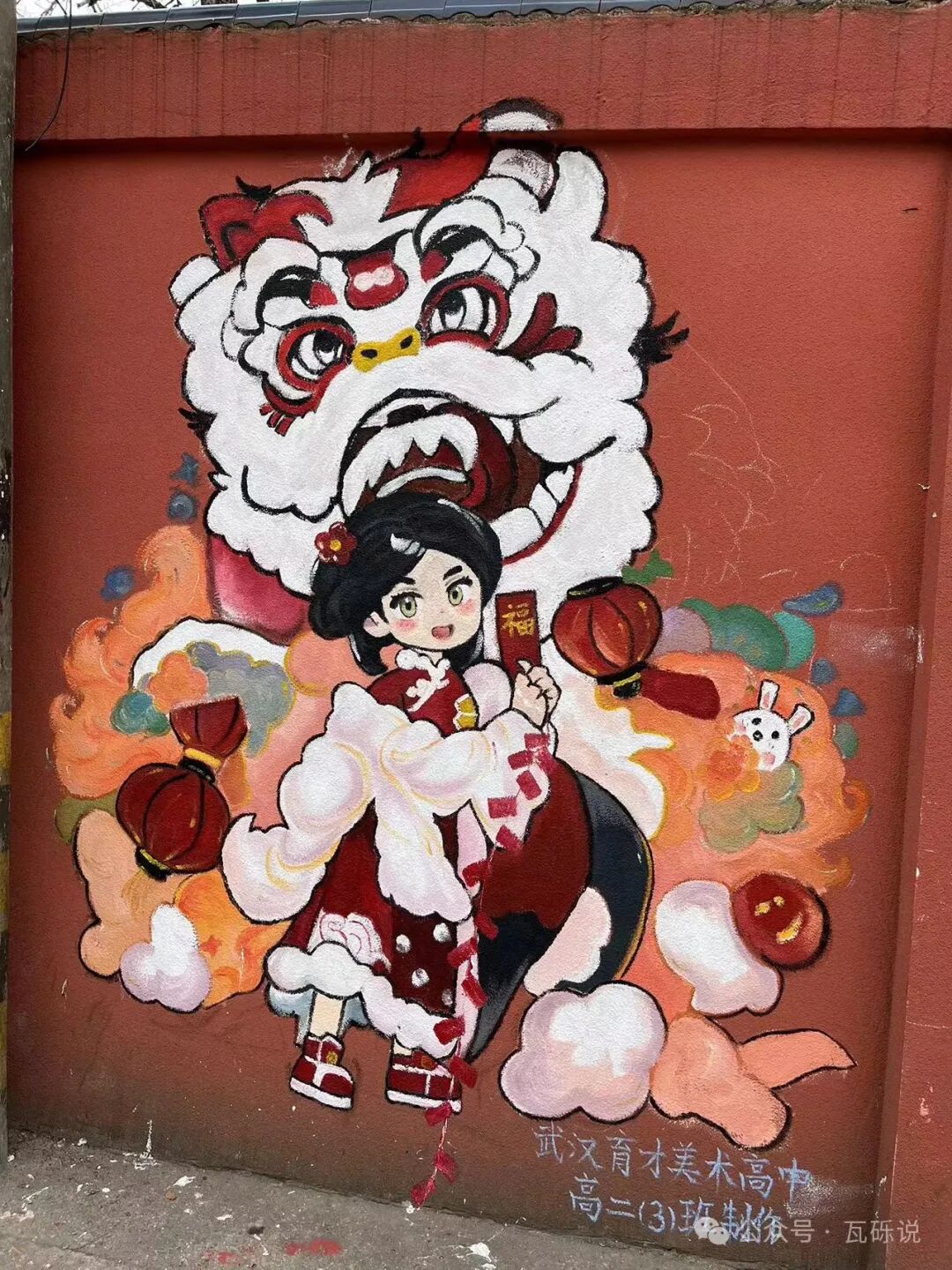 2️⃣古德寺外与武汉育才美术高中相邻的小巷子,墙上有许多美术生的画作,色彩明艳,生动有趣,许多主题与新年契合,不少人前往拍照合影。