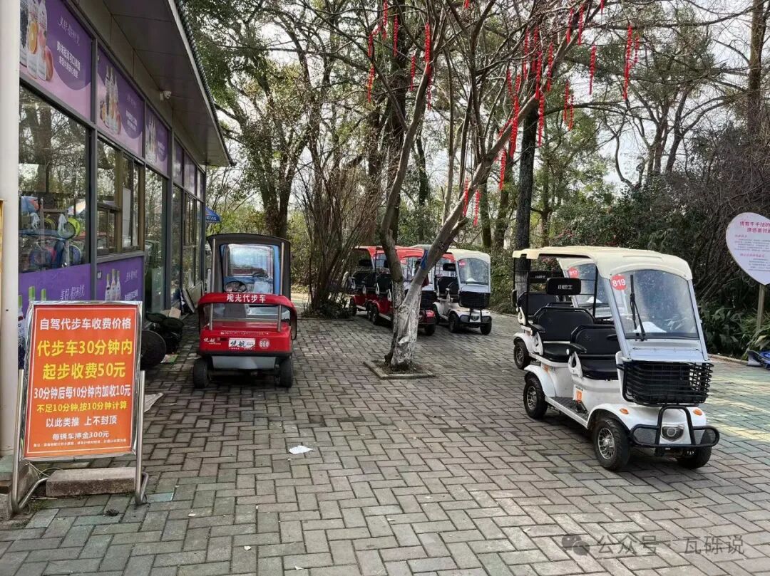 3️⃣园内交通工具:自驾代步车和观光火车。代步车每辆押金300元,限乘2名成人加1名儿童,30分钟内起步收费50元,30分钟后每10分钟内加10元,不足10分钟按10分钟算。观光火车每位价格40元,1.1米以下儿童半价。