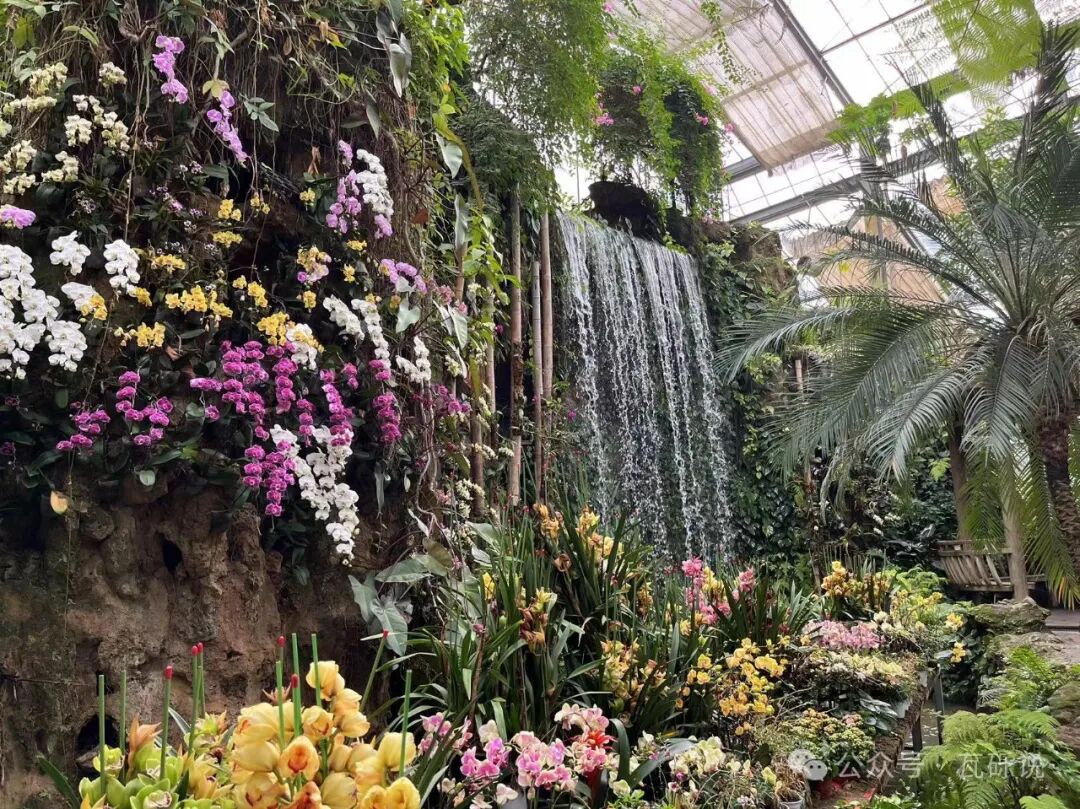 热带兰花展,在温室里面,温度偏高一点。以兰花为主,绣球等其他花朵和植物陪衬点缀。花朵并不是随意摆放的,而是精心设计了造型,用一个个花艺作品组成了园艺作品,还设置有小桥、石洞、瀑布、假山、花船以及曲水流觞的美感。