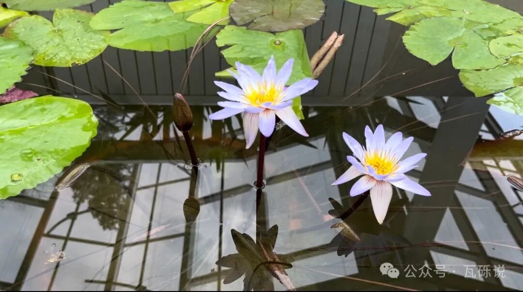 旁边有一排透明房子,里面也是水生植物,是以一个个水池展示。最吸引人的是睡莲,紫色的、粉色的、花朵不多,但开的正好。里面温度很高,游客基本待不了几分钟就会出去,所以人很少。