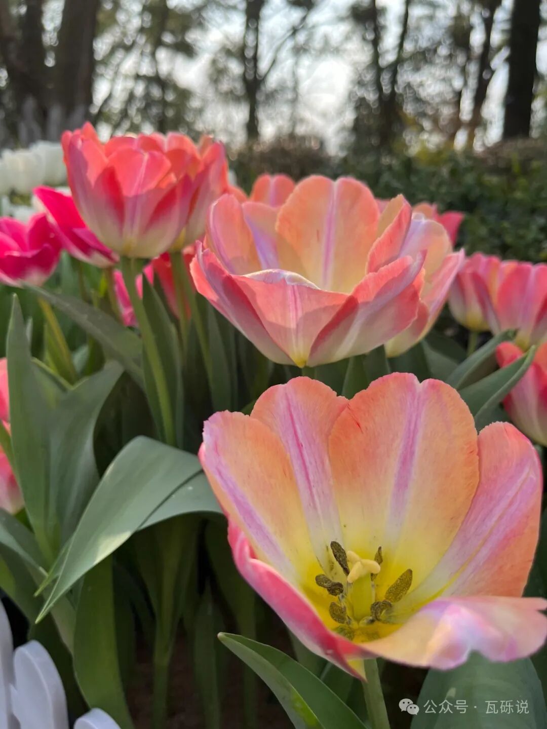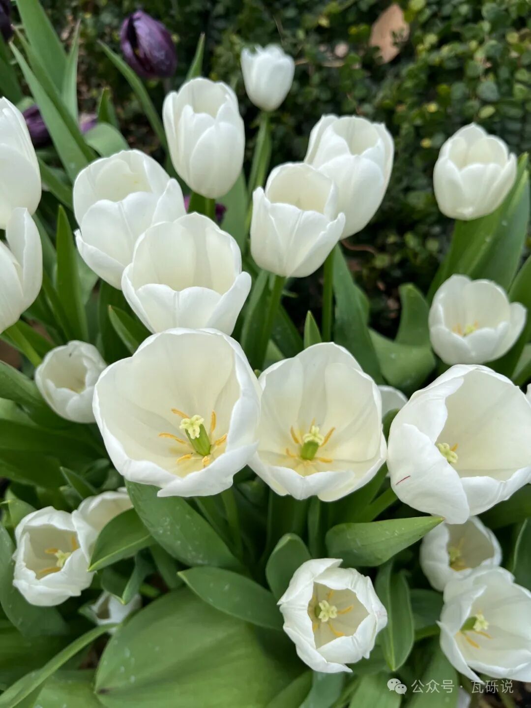 郁金香品种繁多,黄的、红的、紫的、白的,或是张扬的盛开,或羞怯的收拢花瓣,摆放了长长一条供游客观赏。绿叶上还挂着水珠💦,花朵娇嫩的像是刚剥了壳的鸡蛋,有种不真实的美感,简直令人惊艳赞叹。