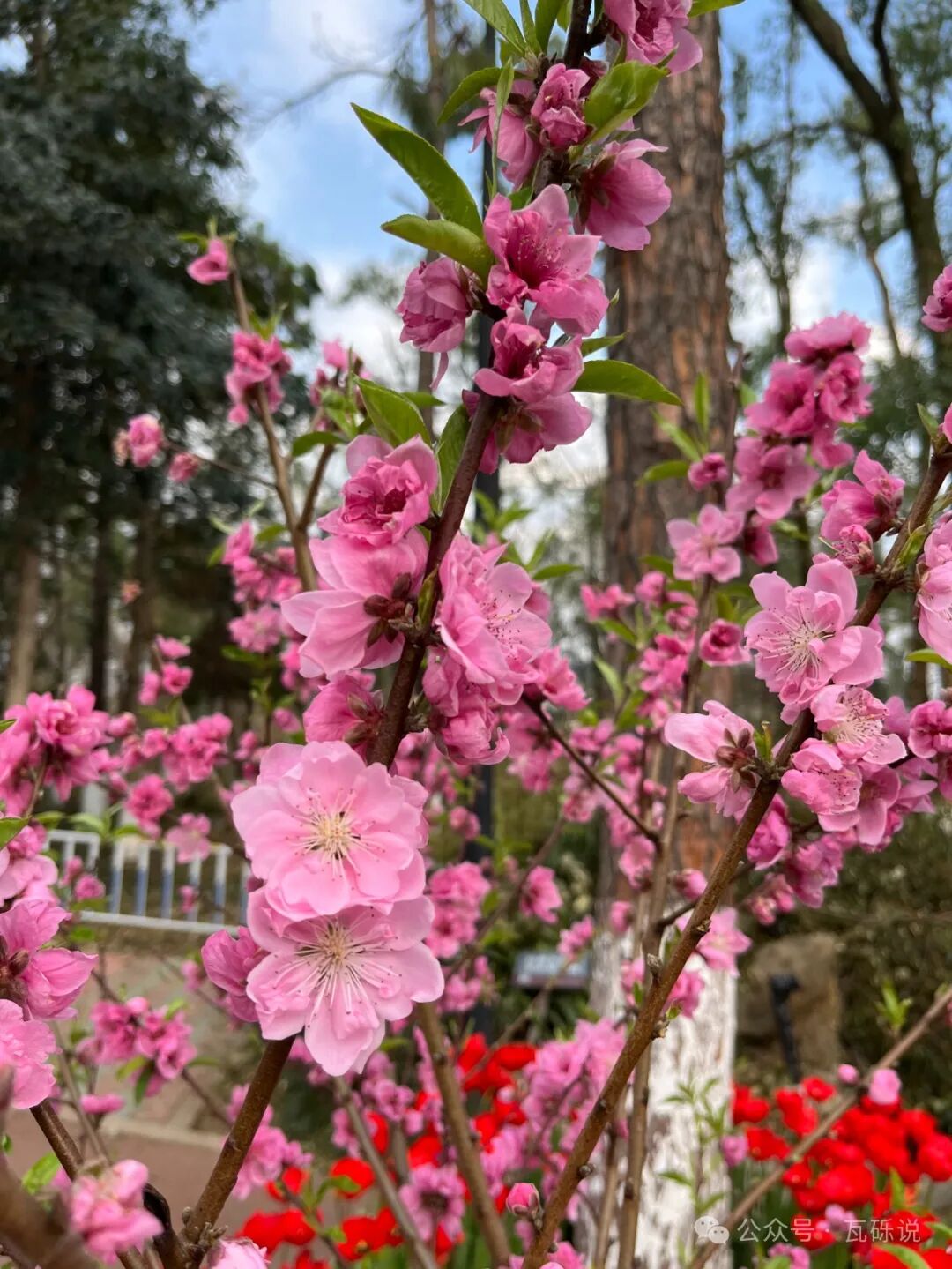 园内在道路两边摆放了多株盆栽桃花作为迎宾,现在桃花开的正艳